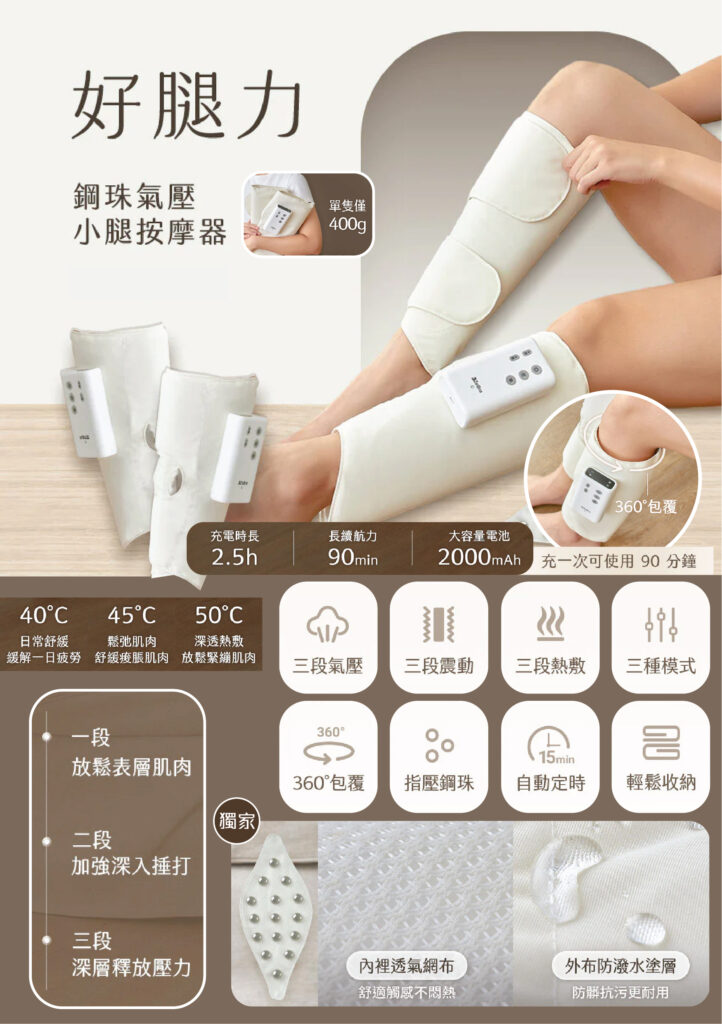 無論是上班久站的服務業、健身後小腿乳酸堆積、久坐導致的循環不佳,或是需要每日進行腿部保養人士,這款按摩器都能提供專業級的深層放鬆效果。