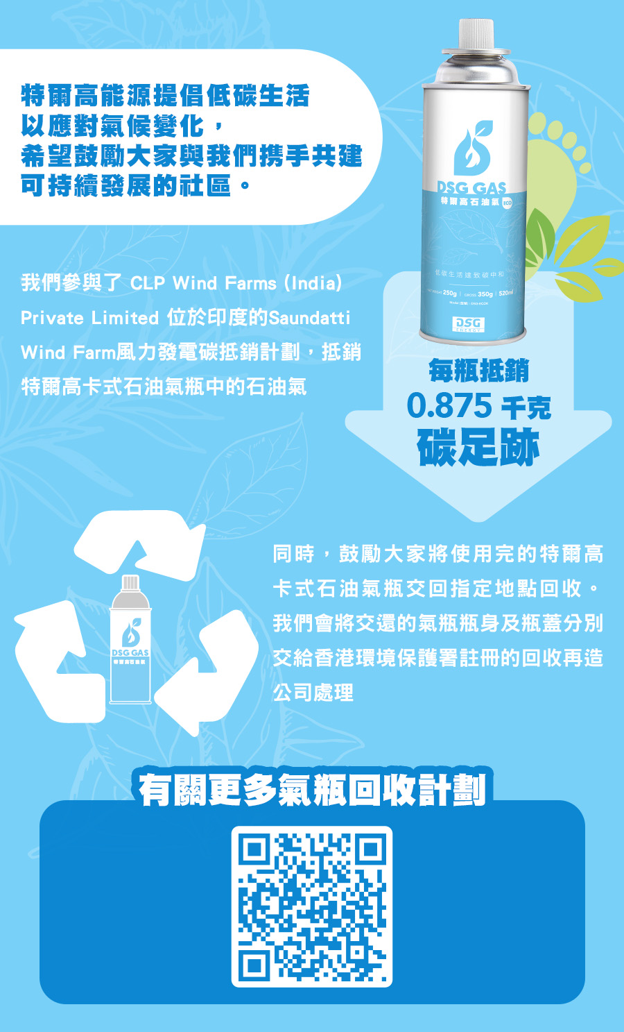 - DSG Gas 特爾高卡式氣可於上述的 DSG Energy 中央服務門市回收