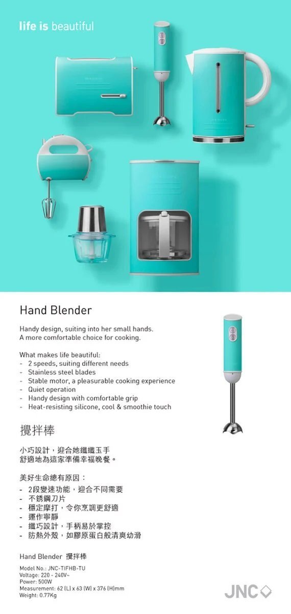 - 附加資料: 2段變速功能,迎合不同需要 / 不锈鋼刀片 / 穩定摩打,令你烹調更舒適 / 運作寧靜 / 纖巧設計,手柄易於掌控 / 獨特的 silicone 防熱外殼,給予您膠原蛋白般清爽幼滑的觸感