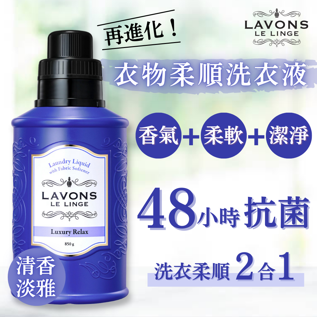 - 含LAVONS織物柔順劑的洗衣液,省時節水,洗滌次數由2次減少至1次!
