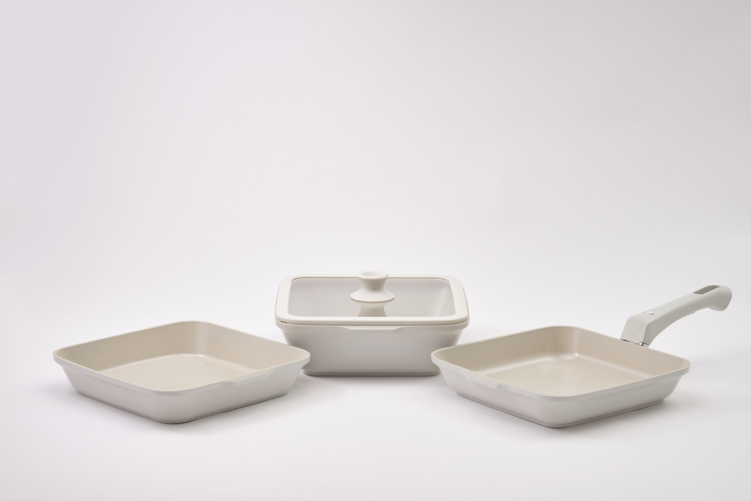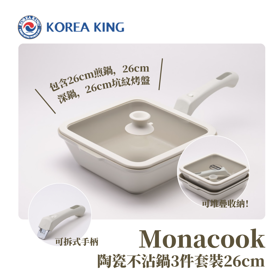 包含深鍋、淺鍋、烤盤,可拆式手柄與鍋蓋,滿足全方位煮食需求。