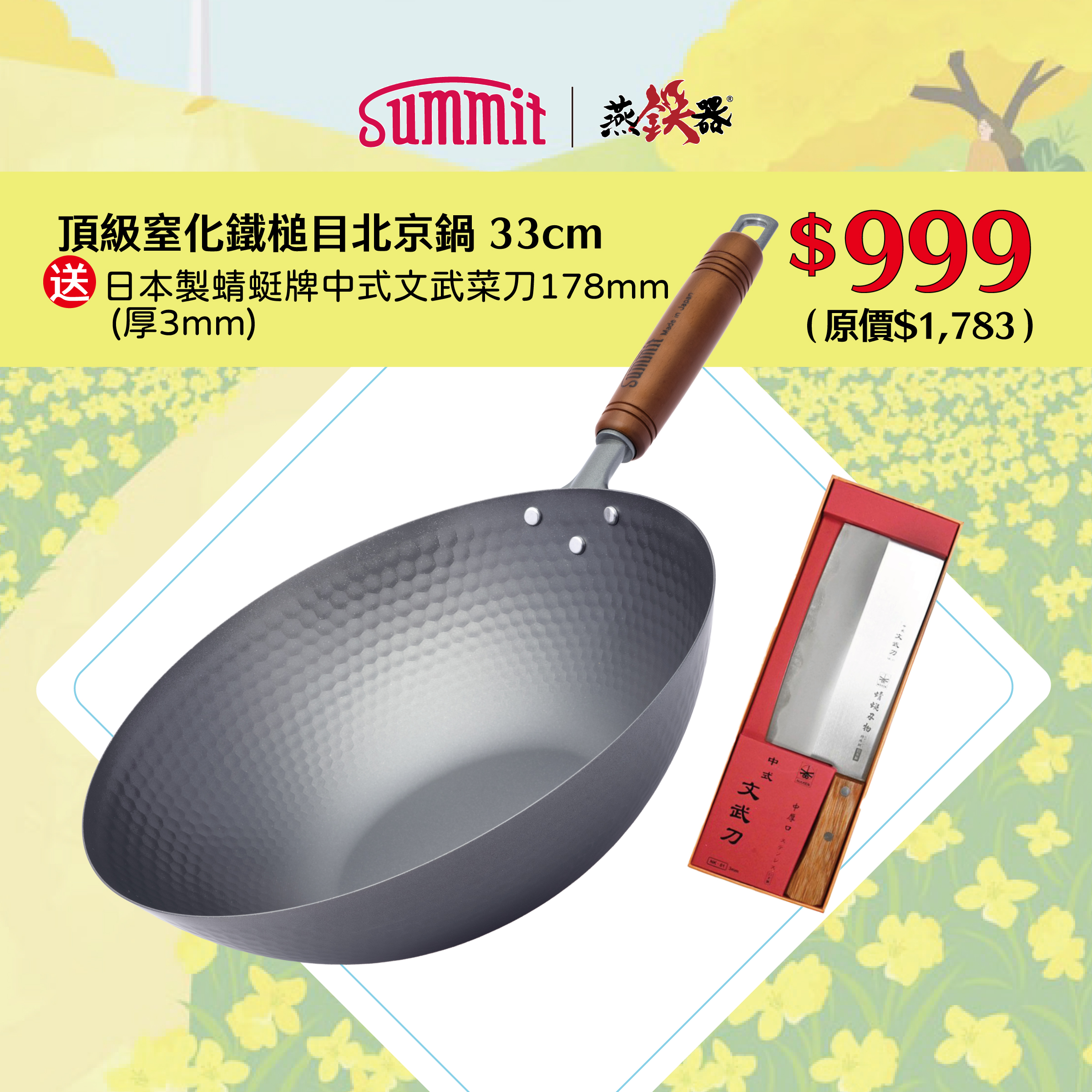 SUMMIT 燕三条製 |頂級窒化鐵鍋系列 槌目北京鍋 33cm 送 日本製 蜻蜓牌 中式文武菜刀 178mm