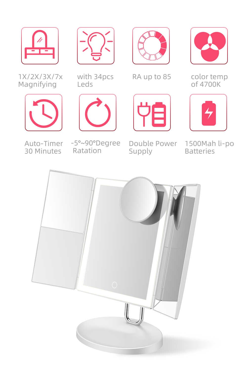 TB1971 帶燈及放大功能 3折摺疊座枱化妝鏡配有 34 個 LED 燈泡,*可調整亮度,可滿足您的照明需求。